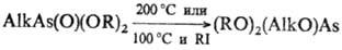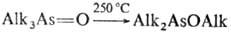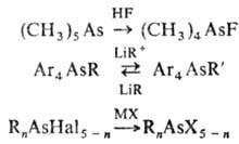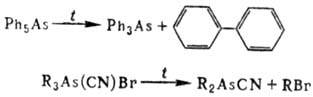Соед. четырехкоординац. As термически менее устойчивы, чем соед. трехкоординац. As, напр. AlknAs(O)Hal3_n отщепляют AlkHal уже при комнатной т-ре. Большинство соед. при 100-250 °С разлагаются или перегруппировываются с образованием, в частности, производных трехкоординац. As, напр.:
