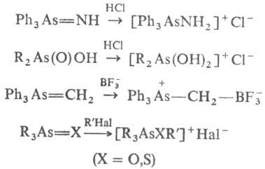 Производные четырехкоординац. As проявляют основные св-ва: протонируются к-тами с образованием арсониевых соед.; образуют аддукты с к-тами Льюиса (напр., с BF3 и S2O3) и солями мн. металлов; алкилируются алкилгалогени-дами, напр.: