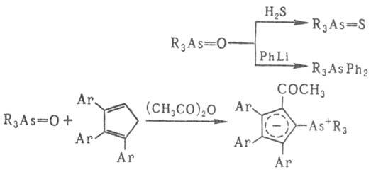 Под действием восстановителей (H2,Ag, SO2, H3PO2, Ph3P и др.) превращаются в соед. трехкоординац. As. При действии электроф. реагентов мышьякорганические соединения типа R3As=X (X = О, S, NR, CR2) легко модифицируются, напр.: