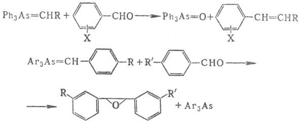 Р-ции алкилиденарсоранов с карбонильными соед. используют для получения олефинов или оксиранов, напр.: