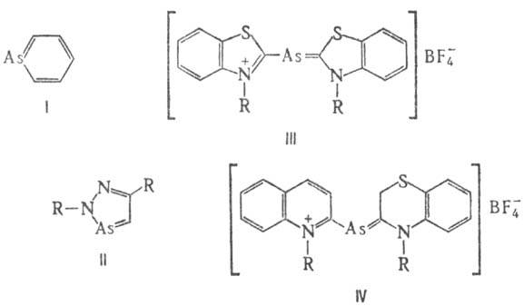 П р о и з в о д н ы е As с к о о р д и н а ц. ч и с л о м 2 сравнительно мало изучены. К ним относятся арсенин (ф-ла I) и его производные, 1,2,3-диазарсолы (II) и арсаметинцианины (III, IV):