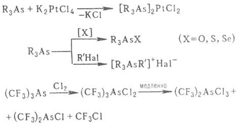 Основные св-ва соед. трехкоординац. As выражены слабее, чем соответствующих производных Р и N (напр., их соли с неорг. к-тами и адцукты с к-тами Льюиса неустойчивы); однако эти производные могут служить лигандами при комплексообразовании с солями переходных металлов. Соед. легко присоединяют О2, S, Se, Hal2, образуя соответствующие производные четырех- и пятикоординац. As, алки-лируются алкилгалогенидами, напр.: