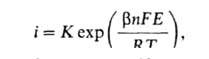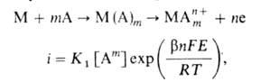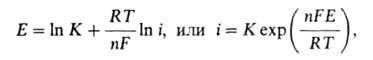 При i > iо растворение протекает с кинетич. контролем, т.е. лимитируется собственно электрохим. стадией - переносом заряженной частицы через границу металл-р-р, и его скорость изменяется с потенциалом Е по закону: