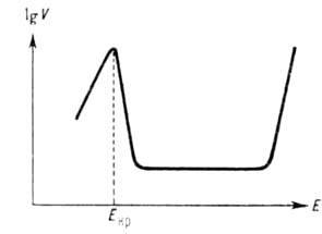 Нередко анодное растворение осложняется вторичными явлениями. Так, образование на пов-сти растворяющегося металла фазовых или адсорбционных солевых или оксидных слоев приводит к пассивации анодного растворения (см. Пассивность металлов), к-рая проявляется в ослаблении зависимости его скорости от потенциала, в достижении предельной плотности тока растворения, а иногда и в изменении типа зависимости. В водных средах повыш. склонностью к пассивации отличаются мн. переходные металлы (Mo, Cr, Ni, Fe и др.). Для них характерен критич. потенциал Екр, зависящий от природы металла и рН р-ра. При достижении Екр обычное увеличение скорости анодного растворения сменяется ее резким снижением, иногда до неск. порядков величины. После этого в большом интервале значений потенциала скорость анодного растворения сохраняется постоянной, а затем снова начинает экспоненциально расти с потенциалом (см. рис.). Последнее явление, известное как перепассивация, обусловлено новым анодным процессом (окислением металла до ионов высшей валентности), к-рый лежит в основе электрохим. технологии получения высших кислородных соед. ряда металлов, напр. Mn, Cr. При анодном растворении сплава возможен неравномерный переход его компонентов в р-р, т.е. избирательное растворение одних компонентов и обогащение поверхностного слоя сплава другими.