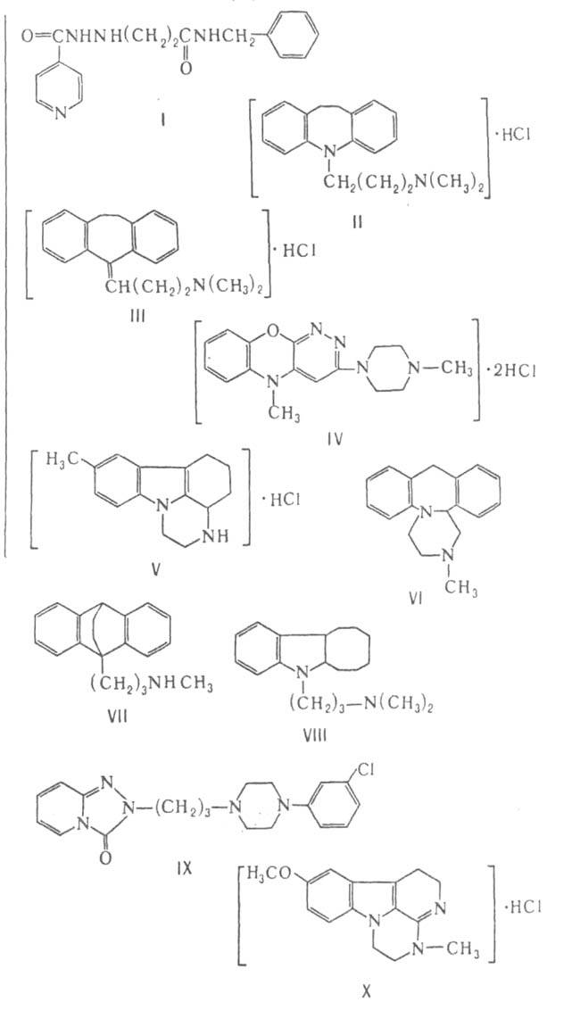 Антидепрессанты делят на препараты, ингибирующие моноаминоксидазу и тем самым тормозящие дезаминирование (инактивацию) норадреналина и серотонина, и препараты, к-рые блокируют обратный нейрональный захват этих медиаторов (т. наз. трициклич. антидепрессанты). Осн. препараты первой группы - производные гидразина, из к-рых практич. применение имеет ниаламид (ф-ла I), второй группы -имизин (II), амитриптилин (III), а также азафен (IV). Получены также лек. ср-ва, отличающиеся по структуре и механизму действия от рассмотренных ("типичных") антидепрессантов. К числу таких "атипичных" антидепрессантов относятся пиразидол (V), миансерин (VI), людиомил (VII), иприндол (VIII), тразодон (IX), инказан (X) и др. Предполагают, что они влияют на чувствительность постсинаптич. рецепторов к действию нейромедиаторов. Большинство антидепрессантов второй группы метаболизируются в организме с образованием деметилированных соед.: N-оксидов и глюкуронидов.