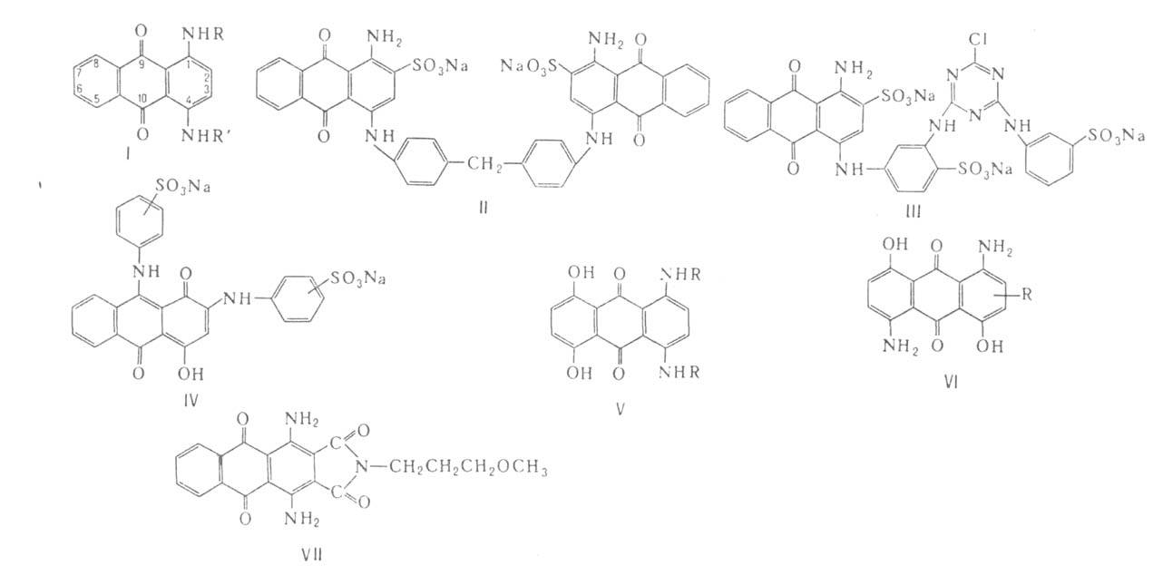 1,4-Аминогидроксипроизводные антрахинона - красители от розового до фиолетового цвета. Их получают: 1) взаимод. лейко-1,4-дигидроксиантрахинона с амином в орг. р-рителе при 70-90°С в присут. Н3ВО3 с послед. окислением воздухом; 2) заменой атома галогена на группу ОН в 1-амино-4-галогенантрахинонах действием H2SO4 в присут. Н3ВО3. Напр., 1-амино-4-гидрокси-, 1-амино-2-метокси-и 1-амино-2-фенокси-4-гидроксиантрахиноны - дисперсные красители красного цвета, розового с желтоватым и розового с синеватым оттенками соответственно, 1-(n-толиламино)-4-гидроксиантрахинон-жирорастворимый фиолетовый краситель, а его сульфопроизводное-кислотный краситель для шерсти. Среди др. аминогидроксипроизводных антрахинона используют соед. ф-лы IV; его получают взаимод. 1,2,4-тригидроксиантрахинона (пурпурина) с анилином в присут. Н3ВО3 и послед, сульфированием. Этот краситель окрашивает шерсть по хромовой протраве в сине-черный цвет.