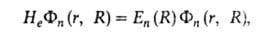 В n-м состоянии система электронов описывается электронной волновой ф-цией Фn (r, R), к-рая зависит от координат R как от параметров. Эта ф-ция и энергия En(R)определяются решением т. наз. электронного ур-ния Шрёдингера