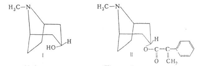 ляет Н2О и дает апоатропин (II), к-рый также выделен из растений. Атропин представляет собой рацемич. смесь изомероа Физиол. активностью обладает только ( — )-гиосциамин. Вероятно, именно он содержится в растениях, а атропин образуется в процессе выделения. При нагр. до 110°С (-)-гиосциамин образует рацемическую смесь, которую можно разделить на стереоизомеры с помощью (+)-камфорсульфокислоты.
