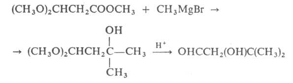 Ацетали и кетали устойчивы в щелочных средах и очень легко гидролизуются в кислых до альдегидов и кетонов, вследствие чего ацетальную группировку используют для защиты карбонильной группы при проведении р-ций по др. реакц. центрам в нейтральной или щелочной среде; напр., получение1043-9.jpgгидроксиальдегидов из эфиров альдегидокислот: