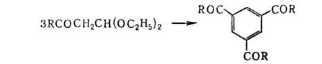 Для ацеталей и кеталей, имеющих другие функциональные заместители, характерны внутри- и межмолекулярные циклизации с образованием карбо- или гетероциклич. соединений; напр., ацетали1043-13.jpgкетоальдегидов тримеризуются в производные бензола: