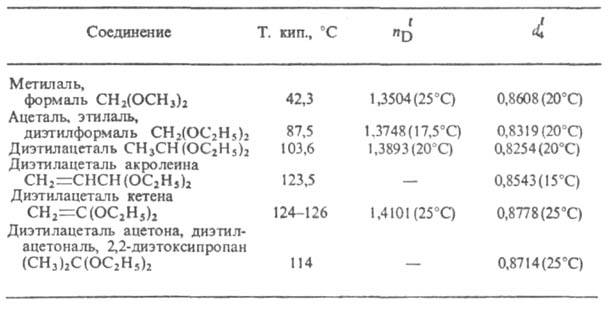 Ацетали и кетали - бесцв. жидкости с приятным запахом (см. табл.); раств. в орг. р-рителях, не раств. в воде. В небольших кол-вах содержатся в виноградных винах.