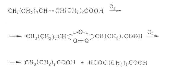 В пром-сти азелаиновую кислоту получают из олеиновой или линолевой к-ты озонолизом или окислением HNO3, H2O2, Сr2О3, КМnО4 или др. При озонолизе (комнатная т-ра и нормальное давление) образуется озонид, подвергающийся при 75-120°С термоокислит. разложению в среде монокарбоно-вой к-ты (напр., пеларгоновой) с образованием азелаиновой кислоты и пе-ларгоновой к-ты, напр.: