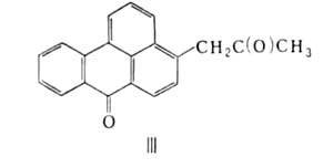 Электроф. реагенты замещают атомы Н в положениях 3 и 9. Так, бромированием суспензии бензантрона в смеси СН3СООН и НС1 при 70°С получают 3-бромбензантрон (т. пл. 173°С; выход 96%), а в конц. H2SO4 или в хлорсульфоновой к-те при 0-40°С (кат.-I2)-3,9-дибромбензантрон (т. пл. 255-256°С; выход 98%). Атомы брома в этих соединениях очень подвижны, что используют в произ-ве кубовых красителей. Бензантрон сульфируется конц. H2SO4 до бензантрон-9-сульфокислоты, хлорсульфоновой к-той в среде о-дихлорбензола - до бензантрон-3-сульфокислоты, олеумом-до бензантрон-3,9-дисульфокислоты, нитруется 87%-ной HNO3 в нитробензоле при 40-50°С до 3-нитропроизводного. Нуклеоф. реагенты замещают атом Н в положениях 2 и 4. Так, при прямом аминировании образуется 4-аминобензантрон, при взаимод. с анилином-4-фениламинобензантрон. При сплавлении со щелочью в присут. безводного CH3COONa при 225°С бензантрон конденсируется до виолантрона - важного красителя для хлопка (см. Полициклические кубовые красители). В присут. КОН реагирует с соединениями, имеющими подвижный атом Н, напр. с ацетоном получают кетон ф-лы III. У бензантрона слабо выражены св-ва, характерные для кетонов, т.е. он не реагирует с NaHSO3, а оксим образует с трудом (выход 30%) при кипячении в пиридине с гидроксиламином в течение 20 ч.