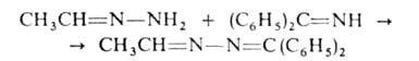 Скорость р-ции зависит от типа карбонильного соед. и уменьшается в ряду: альдегиды > алкилкетоны > > алкиларилкетоны > диарилкетоны. Несимметричные азины получают также взаимод. гидразонов с кетиминами, напр.: