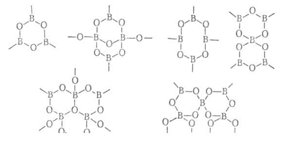 Структуры боратов включают борокислородные группировки - "блоки", содержащие от 1 до 6, а иногда и 9 атомов В, напр.:
