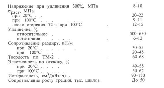 Свойства вулканизатов. Осн. достоинства вулканизатов стереорегулярных бутадиеновых каучуков- высокие эластичность и износостойкость. Св-ва резин на основе бутадиеновых каучуков, содержащих 87-95% звеньев 1,4-цис (наполнитель - активный техн. углерод; 50 мас. ч.), приведены ниже: