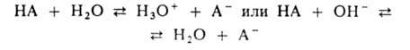 где [НА] и [А-] -равновесные концентрации соотв. к-ты и основания, рКа= —lgКа. Это значение рН остается практически постоянным, т.к. при добавлении небольших кол-в сильных к-т или оснований ионы Н3О+ или ОН-связываются основанием (к-той) с образованием сопряженной к-ты (основания).