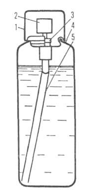 Аэрозольная упаковка: 1-колпачок; 2-распылит. головка; 3-клапан; 4-баллон; 5-сифонная трубка.