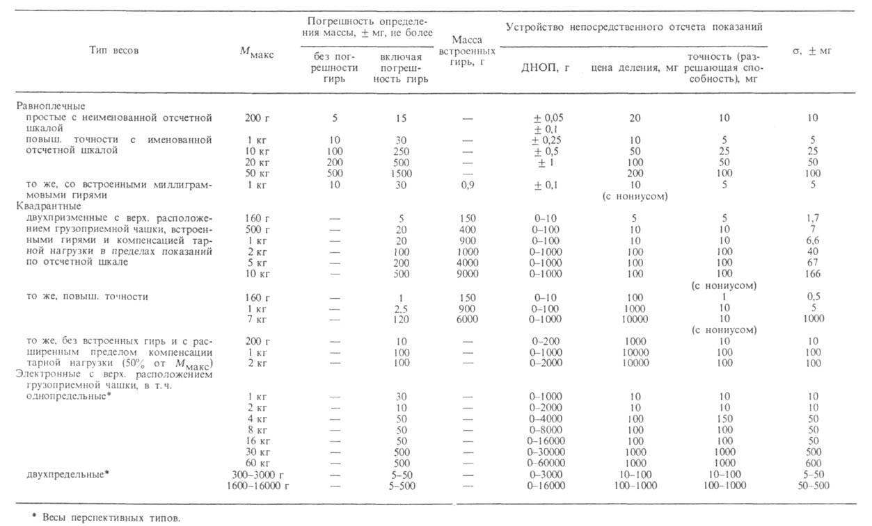 Др. важные характеристики: наиб. предел взвешивания Ммакс-наиб. масса тела, к-рое м. б. взвешено на данных весах с установленной для них точностью; диапазон непосредственного отсчета показаний по шкале (ДНОП) - в его пределах предпочтительно определяют содержание компонентов при хим. анализах; цена деления - значение одного деления шкалы или единицы младшего разряда отсчетного устройства, выраженное в единицах массы; разрешающая способность - характеризует точность отсчета показаний весов (обычно единица младшего разряда цифрового отсчетного устройства, а также 0,5, 0,05 или 0,01 цены деления шкалы соотв. без нониуса и с нониусом). Для суммарной метрологич. оценки точности применяется обобщенный показатель - класс точности (соответствует классу точности гирь), определяющий правильное соотношение между допускаемой погрешностью показаний, ценой деления, разрешающей способностью,