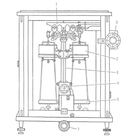 Рис. I. Равноплечиые трехпризменные лабораторные весы аналитической группы: 1-коромысло; 2-успокоитель; 3-рукоятки механизма наложения встроенных гирь с оцифрованными лимбами; 4-экран с изображением проекц. шкалы; 5-грузоприемная чашка; 6-колонка; 7-рукоятка арретира-изолира.
