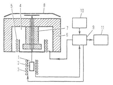 Рис. 4. Принципиальная схема электронных лабораторных весов: 1 -датчик; 2-сердечник; 3, 5-соотв. катушки датчика и силовозбудителя; 4-силовозбудитель; 6-постоянный магнит; 7-стержень; 8-грузоприемная чашка; 9-электронный блок; 10-источник питания; 11-цифровое отсчетное устройство.