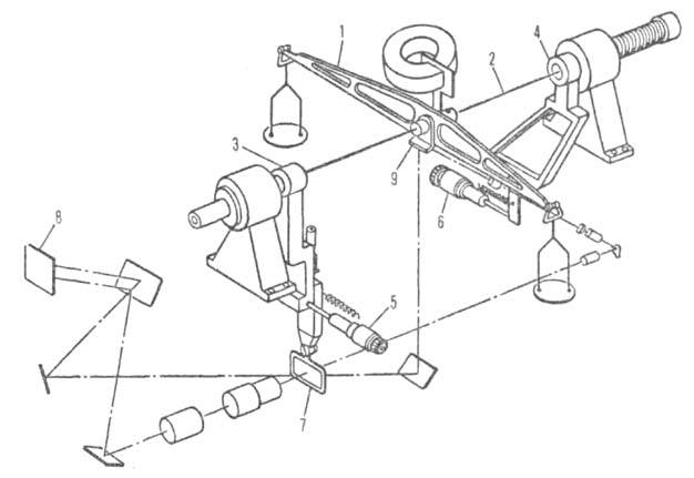 Рис. 5. Крутильноравноплечные лабораторные весы: 1-коромысло; 2-нить-растяжка; 3, 4-втулки; 5, 6-рукоятки; 7-проекц. шкала; 8-экран; 9-зеркало.
