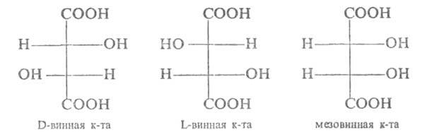 ВИННЫЕ КИСЛОТЫ (дигидроксиянтарные к-ты), мол. м. 150,09; бесцв. кристаллы. Существует в виде трех стереоизомеров и рацемата (виноградной к-ты; см. ниже):