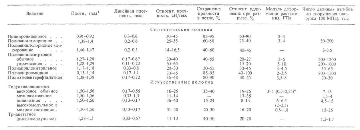 Табл. 1.-СВОЙСТВА ШТАПЕЛЬНЫХ ВОЛОКОН ПРИ 20°С И ОТНОСИТЕЛЬНОЙ ВЛАЖНОСТИ ВОЗДУХА 65%