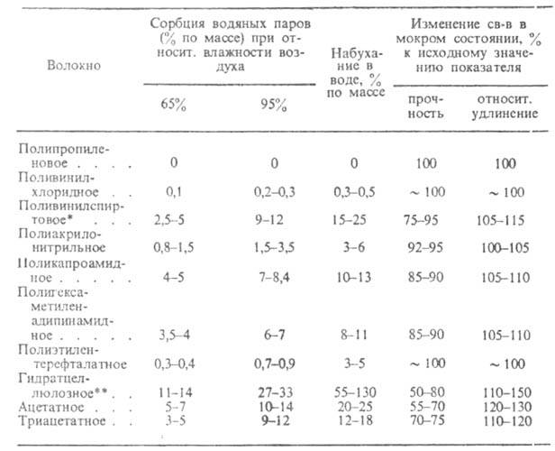 Табл. 3-СОРБЦИЯ ВОДЯНЫХ ПАРОВ ХИМИЧЕСКИМИ ВОЛОКНАМИ (НИТЯМИ), ИХ НАБУХАНИЕ И СВОЙСТВА В МОКРОМ СОСТОЯНИИ ПРИ 20°С