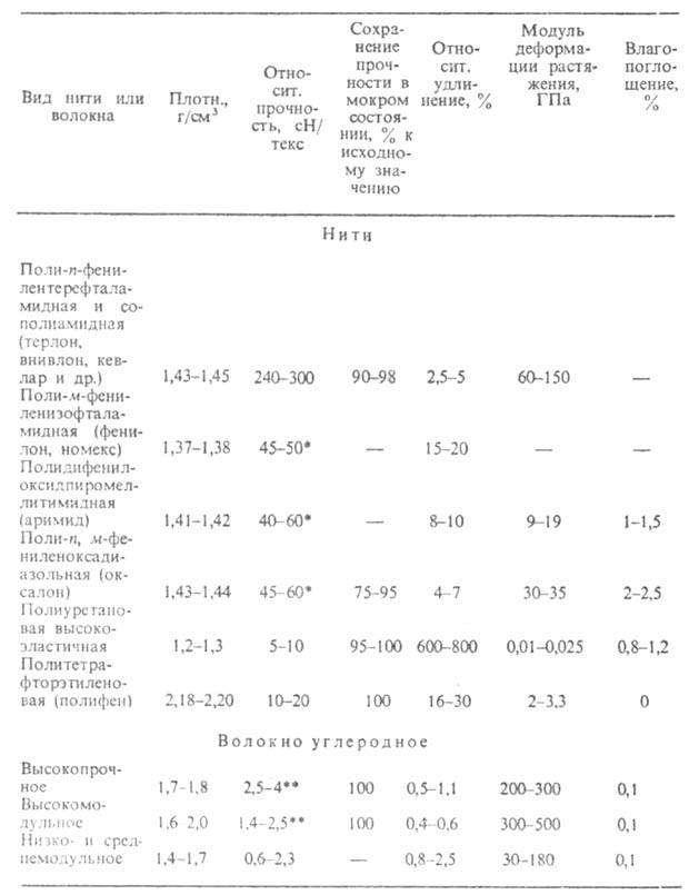 В 60-70-е гг. созданы волокна химические из полимеров со специфич. св-вами, напр.: термостойкие волокна (из ароматич. полиамидов, полиимидов и др.), выдерживающие длит. эксплуатацию при 200-300°С; углеродные, волокна, получаемые карбонизацией волокон химических и обладающие высокой жаростойкостью (в бескислородных условиях до 2000 °С, в кислородсодержащих средах до 350-400 °С); фторволокна (из фторсодержащих карбоцепных полимеров), устойчивые в агрессивных средах, физиологически безвредные, обладающие хорошими антифрикц. и электроизоляц. св-вами. Нек-рые из этих волокон характеризуются также более высокими, чем обычные волокна химические, прочностью, модулем, большей растяжимостью и др. (табл. 4).