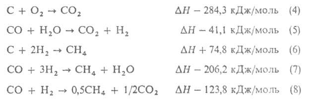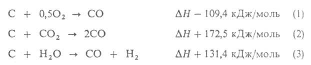 Газификацию твердых топлив можно рассматривать как неполное окисление углерода. наиб. часто окислителями служат О2 (р-ция 1), СО2 (2) и водяной пар (3):