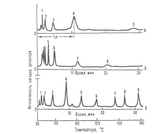 Хроматограммы, полученные при разделении смеси соединений с разл. т-рами кипения: А и Б-изотермич. разделение при 45 и 120°С соотв.; В-разделение при программировании т-ры (скорость повышения т-ры 4,7°С/мин); 1 -пропан; 2-бутан; 3-пентан; 4-гексан; 5-гептан; 6-октан; 7-бромоформ; 8-м-хлортолуол; 9 - броммезити лен.
