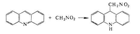 Акридин-слабое основание (рКа 5,6 при 20 °С, в воде). Обладает ароматич. св-вами. Обратимо димеризуется на свету. Легко восстанавливается в акридан (9,10-дигидроакридин) амальгамой Na, Zn в НС1 и на никеле Ренея. Под действием КМnО4 в щелочной среде и при озонолизе в спирте окисляется в 2,3-хинолиндикарбоновую к-ту, надбензойной к-той-в N-оксид, способный, подобно N-оксиду пиридина, к р-циям замещения. При нагр. с S в запаянной трубке при 190°С образуется 9-тиоакридон, при взаимод. с сильными минер. к-тами-хорошо кристаллизующиеся соли акридиния (аналогичные пиридиниевым и хинолиниевым), легко подвергающиеся нуклеоф. атаке в положение 9. В р-ции электроф. замещения акридин вступает с трудом и неоднозначно, поэтому замещенные обычно получают из акридона. При нитровании акридина образуется смесь изомерных нитроакридинов с преимущественным содержанием 2-нитроакридина. В р-ции с Вr2 в СС14 образуется N-бромакридинийбромид, в СН3СООН-2-бром- и 2,7-дибромакридин. Вступает в р-цию Чичибабина с NaNH2, образуя 9-аминоакридин. Нек-рые реагенты (напр., KCN, фениллитий) акридин присоединяет, подобно антрацену, в положения 9 и 10, но не вступает в диеновый синтез. При взаимод. с метилфенилсульфоном в гексаметаполе [(CH3)2N]3PO образует 9-метилакридин, с соед., содержащими реакционноспособную метиленовую группу, в присут. щелочных агентов-акридан с заместителем в положении 9, напр.: