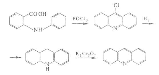 Акридин содержится в небольшом кол-ве в кам.-уг. смоле. Его получают из 2-анилинобензойной к-ты: 1) взаимод. с H2SO4 с послед. восстановлением и окислением образовавшегося акридона; 2) по р-ции: