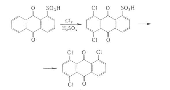 1,4,5,8-Тетрахлорантрахинон синтезируют взаимод. 1,8-дихлорантрахинон-1,5- или 4,5-дихлорантрахинон-1,8-дисульфокислот с КС1О3 при кипячении в среде разб. НС1 или непосредственно хлорированием антрахинона в олеуме.