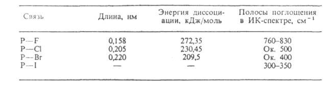 Свойства. Большинство галогенфосфинов-жидкости (табл. 2) с характерным неприятным запахом; хорошо раств. в орг. р-рителях. Диапазон хим. сдвигов в спектре ЯМР 31Р относительно 85%-ной Н3РО4 от 0 до 250 м.д.