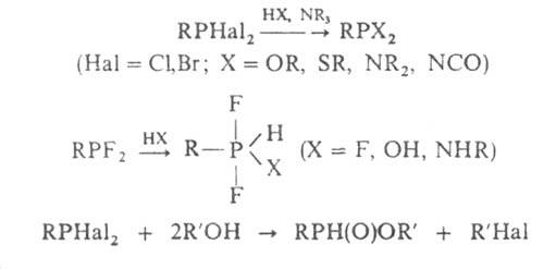 Галогенфосфины-слабые основания. Реагируют с в-вами, имеющими в молекуле гидроксильную группу; в мягких условиях с водой образуют к-ты RPH(O)OH или R2P(O)H. Легко окисляются [напр., CH3PF2 и (СН3)2РС1 на воздухе воспламеняются]. Для окисления галогенфосфинов в галогенангидриды фосфоновых или фосфиновых к-т используют О2, NO2, SO2C12. Сера и нек-рые ее соед. окисляют галогенфосфины до в-в, содержащих связь P=S.