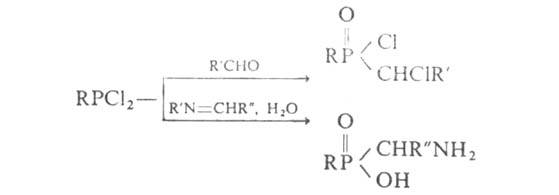 С ненасыщ. карбоновыми к-тами или диенами галогенфосфины дают фосфинаты и фосфиноксиды, в т.ч. циклич. структуры, напр.: