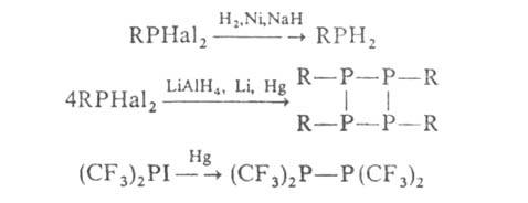 При восстановлении галогенфосфинов образуются фосфины, циклопелифосфины или дифосфины, напр.: