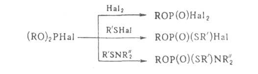 При взаимод. галогенфосфитов с нуклеофилами образуются соед. трех-или пятивалентного Р, напр.: