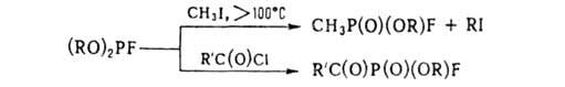 С алкил- и ацилгалогенидами галогенфосфиты вступают в р-цию Арбузова, напр.: