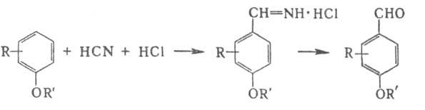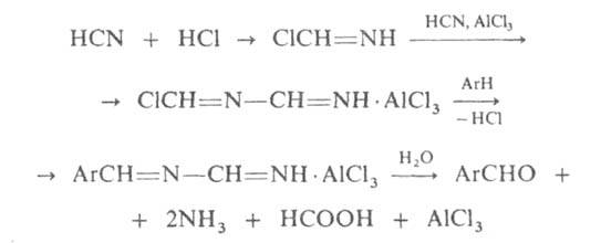 При использовании NaCN в кач-ве реагента, генерирующего HCN, через суспензию цианида и А1С13 в р-рителе и избытке ароматич. соед. пропускают НС1, затем в реакц. смесь добавляют Н2О или этанол. Предполагается, что р-ция осуществляется по схеме: