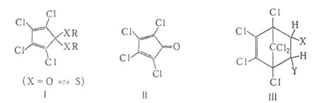 42,29 кДж/кг. Раств. в хлорорг. р-рителях, спирте, не раств. в воде. Гексахлор-1,3-циклопентадиен хлорируется С12 в присут. А1С13 при т-ре не выше 50 °С до октахлорциклопентена. Легко взаимод. со спиртовыми р-рами щелочей, образуя кетали (ф-ла I; X = О), а с Na-coлями меркаптанов-тиокетали (I; X = S). При кислотном гидролизе превращ. в тетрахлорциклопентадиенон (II). Вступает в реакцию Дильса-Альдера в основном как 1,3-диен с образованием производных гексахлорнорборнена (III):