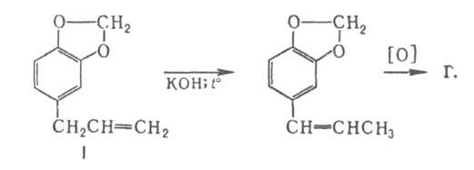 ГЕЛИОТРОПИН (3,4-метилендиоксибензальдегид, пиперональ), мол. м. 150,13; бесцв. кристаллы с запахом цветов гелиотропа; т. пл. 36,5-37 °С, т. кип. 264 °С, 130°С/10 мм рт.ст.; давление пара 372 Па; пороговая концентрация 2,73 * 10-8 г/л; раств. в этаноле, не раств. в глицерине, р-римость в воде 0,2%, легко перегоняется с водяным паром. Содержится в стручках ванили, цветах гелиотропа и сирени, в нек-рых эфирных маслах. При продолжит. действии воды, света, воздуха разлагается. В пром-сти получают щелочной изомеризацией сафрола (ф-ла I) с послед. окислением хромовой смесью или озоном образовавшегося изосафрола: