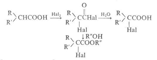 галогенкарбоновой к-ты взаимод. с непрореагировавшей исходной к-той, при этом регенерируется галогенангидрид незамещенной к-ты, к-рый далее снова подвергается галогенированию: