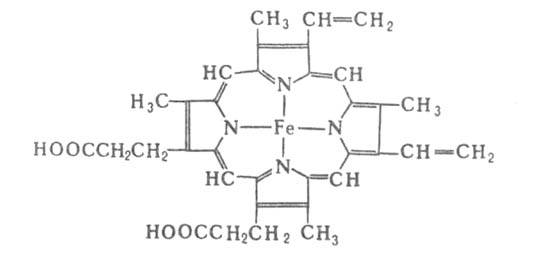 ГЕМОГЛОБИН (от греч. haima- кровь и лат. globus-шар), осн. белок дыхат. цикла, участвующий в переносе О2 от органов дыхания к тканям, а в обратном направлении - СО2. Содержится в эритроцитах крови почти всех позвоночных и гемолимфе большинства беспозвоночных животных. Гемоглобин позвоночных (мол. м. 6,4*104-6,6*104) состоят из четырех попарно идентичных субъединиц (их обозначают греч. буквами; теми же буквами обозначают входящие в состав субъединиц полипептидные цепи, а также гены, кодирующие эти цепи). Каждая субъединица имеет белковую глобиновую часть, состоящую из 140-160 аминокислотных остатков, с к-рой нековалентно связан гем-ферропрото-порфирин (см. ф-лу).