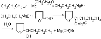 В полулитровую трехгорлую круглодонную колбу, снабженную мешалкой с ртутным затвором, капельной воронкой и обратным холодильником с хлоркальциевой трубкой, помещают 5 г (0,2 г-ат) магниевых стружек, предварительно промытых безводными спиртом и эфиром, 100 мл абсолютного эфира и кристаллик иода. Затем из капельной воронки по каплям прибавляют раствор 32 г (0,26 моль) свежеперегнанного бромистого пропила в 100 мл абсолютного эфира (примечание 1). По окончании прибавления раствора бромистого пропила (продолжительность 2-2,5 часа) реакционную смесь кипятят на водяной бане в течение 1,5 часов до полного растворения магния. Затем содержимое колбы охлаждают льдом и солью и при непрерывном перемешивании в течение 1 часа прибавляют раствор 18,2 г (0,19 моль) свежеперегнанного фурфурола (примечание 2) в 100 мл абсолютного эфира. После прибавления фурфурола смесь кипятят на водяной бане в течение 1-1,5 часов.