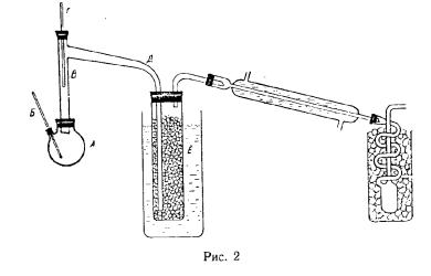 Аппарат для получения фурана показан на рисунке 2. В круглодонную колбу А емкостью 200 мл через боковой тубус вставлен термометр Б, доходящий почти до дна колбы. Горло колбы А плотно закрыто резиновой трубкой, через которую проходит вертикальная трубка В длиной 15 см и диаметром 1,8-2,0 см. Верхнее отверстие трубки В закрывают резиновой пробкой, в которую вставлена длинная стеклянная палочка Г, служащая для сбрасывания в колбу возгоняющейся фуранкарбоновой кислоты. На расстоянии 2,5-3 см от верхнего конца к вертикальной трубке В припаян боковой отвод Д, диаметром 1,8-2,0 см. Более узкая (диаметр 1 см) вертикальная часть отводной трубки Д оканчивается на дне колонки Е диаметром 3,5-4 см и высотой 25 см. Колонка Е заполнена кусками едкого натра, величиной с горошину, отделеными от конца трубки Д слоем ваты (примечание 1). Колонка Е погружена в водяную баню (высокий стакан), нагретую до 45-50 градусов. Отводная трубка колонки Е соединена с нисходящим холодильником, к которому присоединен приемник, находящийся в смеси льда и соли (примечание 2).
