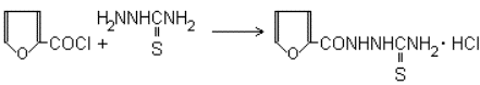 В круглодонной четырехгорлой колбе емкостью 300 мл снабженной мешалкой с ртутным затвором, капельной воронкой, термометром и обратным холодильником с хлоркальциевой трубкой, в течение 20-25 минут кипятят 28 г (0,22 моль) солянокислого тиосемикарбазида с 150 мл сухого пиридина. Содержимое колбы при перемешивании охлаждают льдом и солью до –7,-5 градусов и по каплям приливают 26,1 г (0,2 моль) хлорангидридафуран-2-карбоновой кислоты с температурой плавления 89-90 градусов/32 мм с такой скоростью, чтобы температура смеси не поднималась выше –3,-2 градуса (примечание 1), на прибавление всего количества хлорангидрида требуется 1,5-2 часа. По окончании прибавления, не удаляя бани, перемешивание продолжают еще 4 часа (температура постепенно повышается до комнатной) и затем оставляют на ночь.
