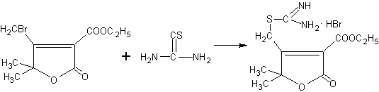 В круглодонную колбу, снабженную обратным холодильником, помещают раствор 22,7 г (0,1 моля) 3-бромметил-4,4-диметил-2-карбэтокси-2-бутен-4-олида (см. с. 19) в 300 мл абсолютного этилового спирта и 7,6 г (0,1 моля) тиомочевины. Реакционную смесь кипятят на водяной бане в течение 4 ч. После охлаждения отгоняют растворитель, твердый остаток перекристаллизовывают из 50 мл этилового спирта. Выход 33,0-40,0 г или 93,5-96,3% теоретического количества, т.пл. 191°.